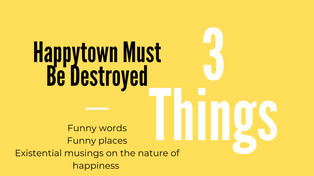 When I’m writing, I normally struggle moving characters from one place to another. (And whenever I can, I cheat, and jump locations between chapters.) But in Happytown Must Be Destroyed, James has made a comedic feature out of moving through the setting of Owt.